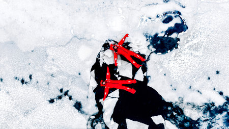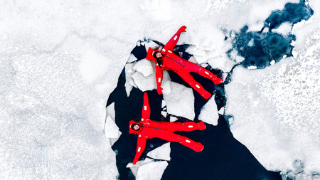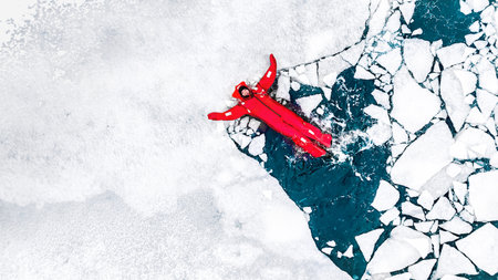 Aerial view of two people ice floating on icy water in bright red survival suits. Arctic frozen landscape. Extreme adventure, ice diving, cold water survival, winter expedition. Fun, outdoor activity.