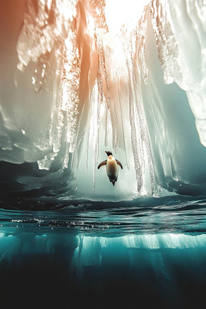 A penguin takes a daring dive from a towering iceberg, creating ripples in the crystalline water below.
