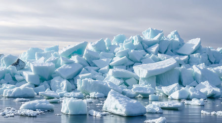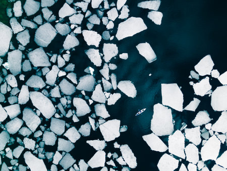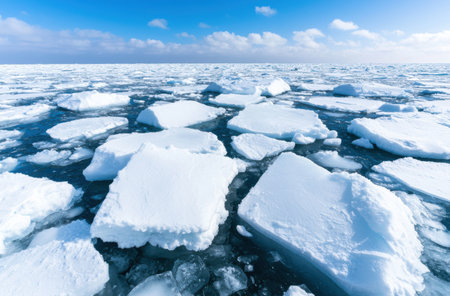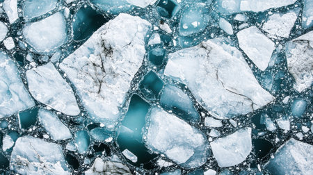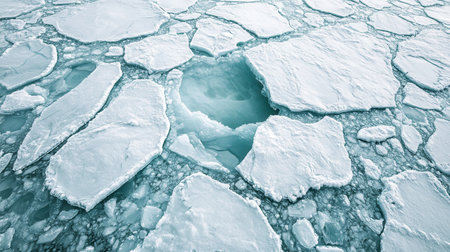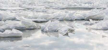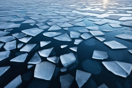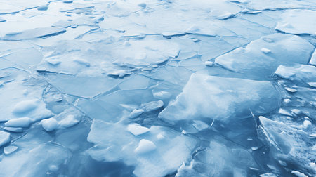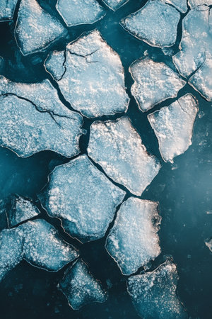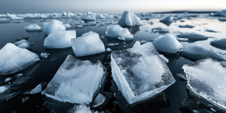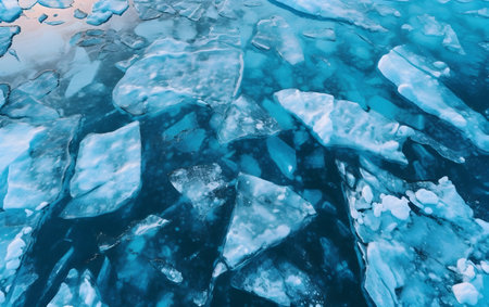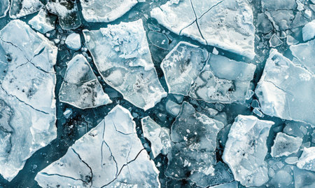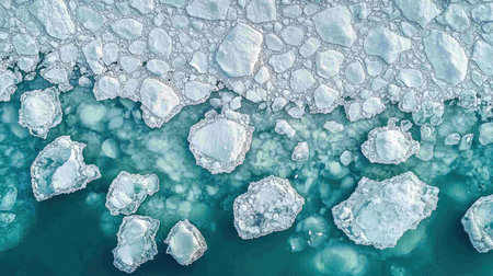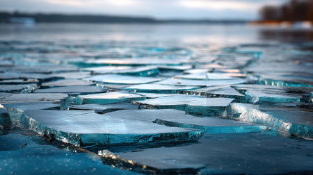 Captivating view of broken ice fragments scattered over a serene water surface, capturing the beauty and stillness of winter touch.