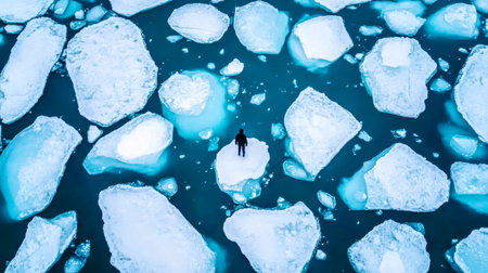 Lone explorer standing on ice floe in glacial lagoon, birds eye view