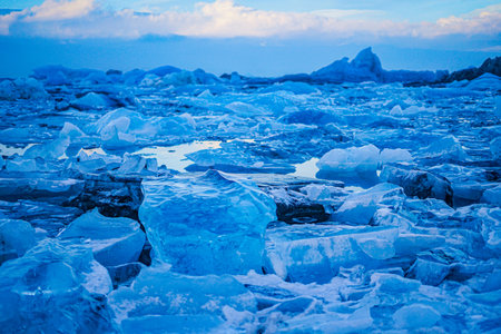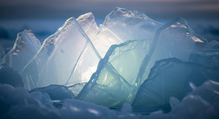 Clear ice chunks are spread out over a snowy surface, glistening under soft sunlight. The cold landscape suggests a serene winter day, with clouds in the background.