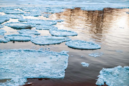 Big floes floating on cold water surface of sea in winter