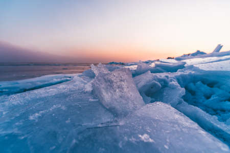 Transparent shining clear ice icicles close-up sparkling on frozen wild lake shore in sunset light. Cold winter nature background