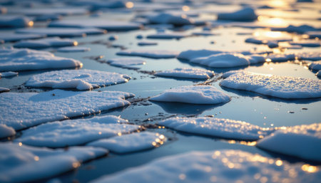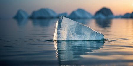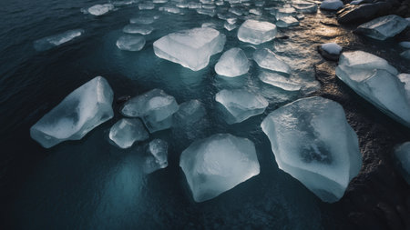 Tranquil Landscape of Floating Ice Chunks on a Serene Water Surface with Gentle Reflections and Soft Light at Sunset