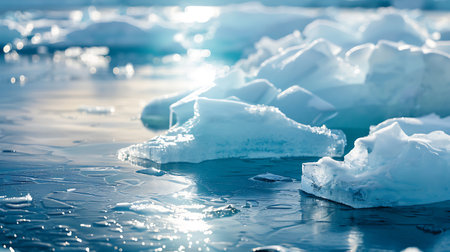 A breathtaking view of ice fragments floating on a water surface, illuminated by bright sunlight, creates a serene winter scene that captivates.