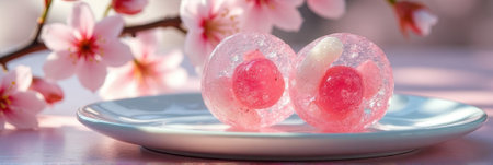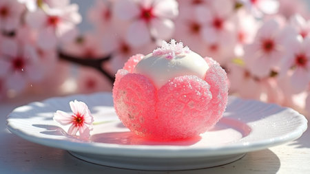 Cherry blossom sakura mochi close-up with pink flowers in background. That the image is generated using AI.