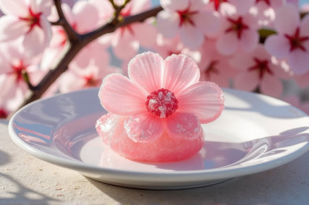 Delicate pink sakura sweet on white plate with blossoming flowers in sunlight. That the image is generated using AI.