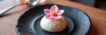 Elegant dessert with pink flower on black plate in natural light. That the image is generated using AI.
