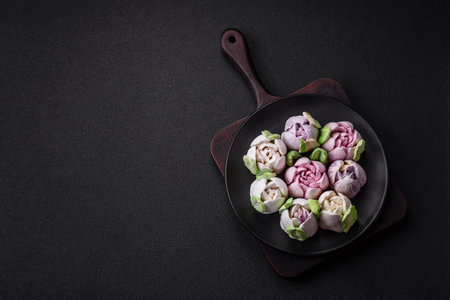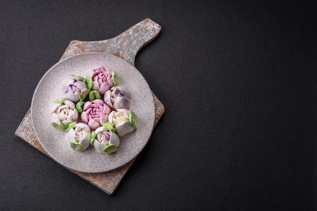 Beautiful tasty marshmallows in the form of tulip buds on a dark concrete background