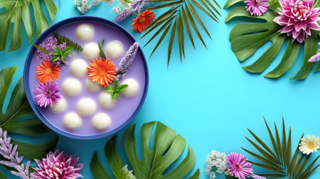 A stunning arrangement featuring round white treats on a purple plate, surrounded by vibrant flowers and lush tropical leaves against a bright blue backdrop.