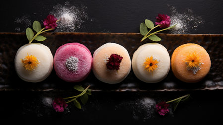 Delightful mochi arrangement with florals and leaves, creating a vibrant and tasty presentation