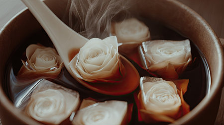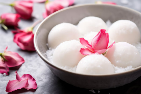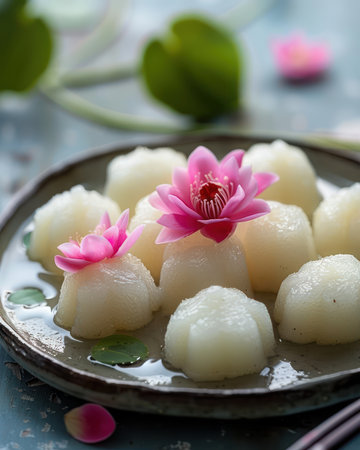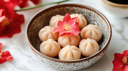 Experience the beauty of sweet dumplings artfully arranged in a bowl, garnished with a vibrant flower, creating a perfect blend of flavor and aesthetics.