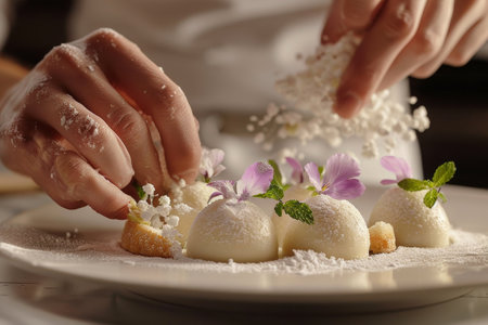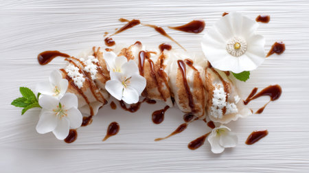 glossy textures on Desserts, edible flowers, Pastel colours, simplicity concept. served in Michelin luxury restaurant. Smooth Textures and Glossy Finish. Modern food