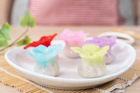 Chinese chives Dumplings Mixed Color or Garlic Chives Dim Sum Rice Cake inside with Taro Slice ,Bamboo shoot and Many kind of vegetable inside the flour, Steamed Served Sweet Black Soy Sauce Chinese Food Style side view, Chinese Food Appetizer dish Style, Oblique view from the top.