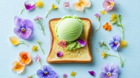 A scrumptious honey toast slice with a scoop of matcha ice cream on top, surrounded by decorative edible flowers, elegantly presented for a dessert treat.