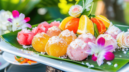 A vibrant display of colorful Thai desserts garnished with tropical flowers, presented elegantly on a leaf plate, showcasing culinary artistry.