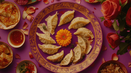 A purple plate with golden patterns, featuring six white dumplings and one yellow pastry in the center of which is an orange flower, surrounded by small bowls filled with various ingredients including sauce, herbs, red flowers, gold leafs, and other decorations on it. The background features a purple wall with roses and some scattered dried petals, creating a festive atmosphere for Chinese New Year's Eve dinner. --chaos 30 --ar 16:9 --v 6.1 Job ID: 22ffd829-28d9-41f2-8b67-cd27152e5aa9