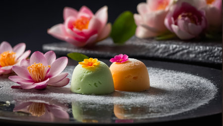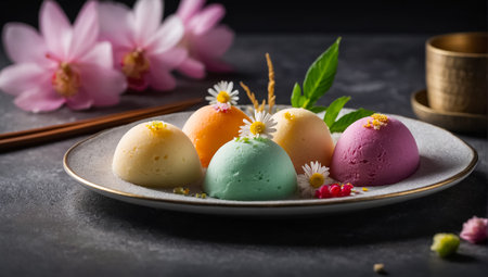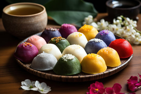 Colorful mochi with floral garnishes on a bamboo tray, tea in the background, perfect for highlighting Japanese dessert elegance. High quality photo