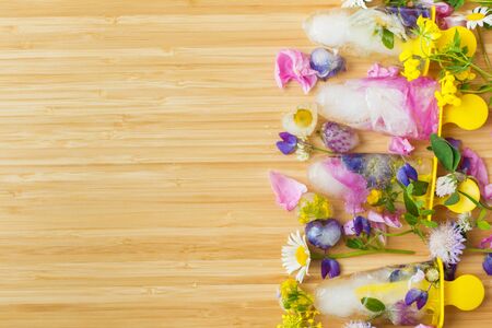 Floral Ice Pops and fresh summer flowers with space for text. Colorful wildflowers in melting ice hearts on wooden background. Hello summer flat lay. Creative image