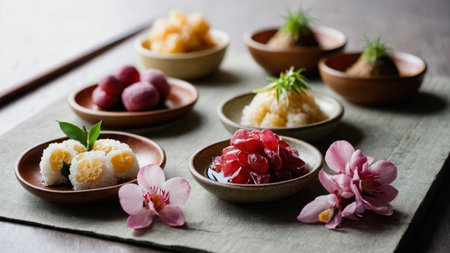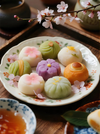 Capture the beauty of traditional Japanese sweets displayed elegantly on a wooden tray, surrounded by delicate cherry blossoms, showcasing artistry and culture.