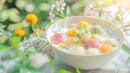Bowl of Bua Loi with multi-colored rice balls in coconut milk, outdoor setting. Sweet traditional Thai dessert. Concept of Thai cuisine, exotic treats, Asian sweet dish, culinary. Copy space
