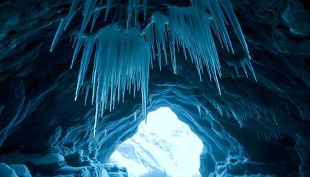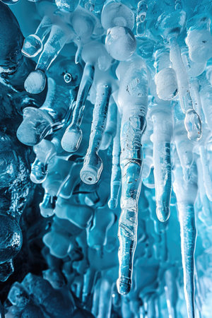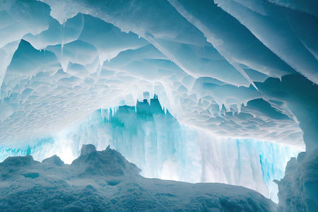 AI Generated. Intricate ice formation with blue textures in a natural frozen cave