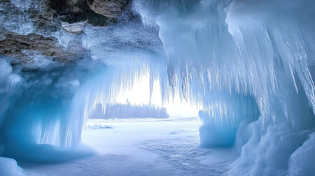 A frozen waterfall with icicles hanging from it. The icicles are clear and blue, and they are suspended from the ceiling. The scene has a serene and peaceful mood