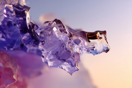 Sharp ice crystals with water droplets glisten in macro view against a blurred bokeh background.