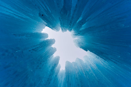 Breathtaking image of frozen ice formations reaching towards the dark blue sky, creating a stunning contrast. Captures the beauty of winter's chill.