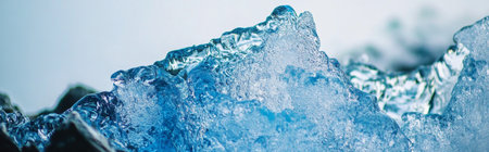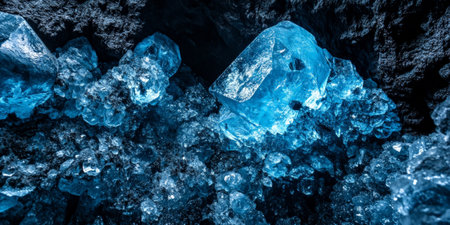 Glacial ice presents a stunning array of shapes and textures, with layers of transparent and opaque blue ice mingling. The image highlights the natural beauty of frozen water, capturing the essence of winter in a remote location.