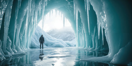 Shimmering Ice Cave Interior A low-angle shot inside a crystalline ice cave, where smooth, translucent walls refract pale turquoise light.