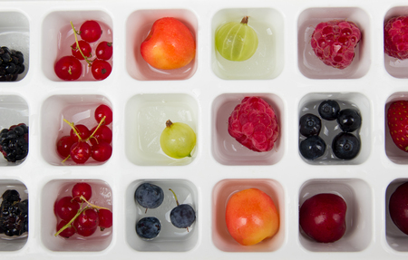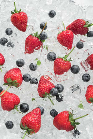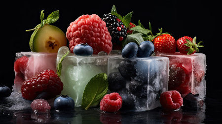 ripe juicy seasonal berries frozen in ice cubes stacked on black