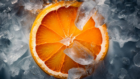 Orange slice on a frozen surface surrounded by ice cubes. Background, banner image. Ai Generative