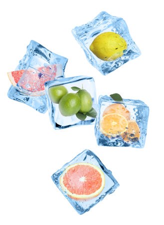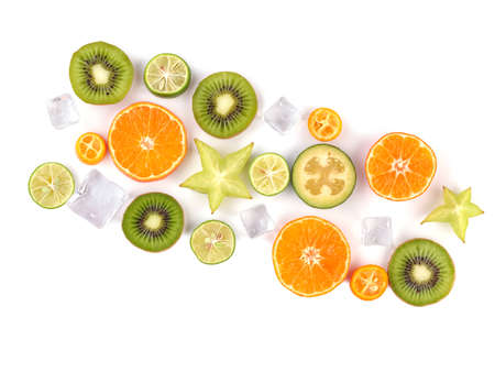 Fresh tropical slices of fruits isolated on white background. Juicy oranges, kiwis, carambolas and ice.