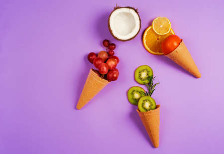 Ice cream with natural fruits. Concept of genuine and biologic fruit. Purple background