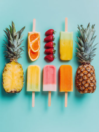 Tropical fruit popsicles sit on sticks next to fresh fruit in a colorful arrangement on a light pastel backdrop for summer fun.