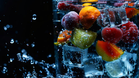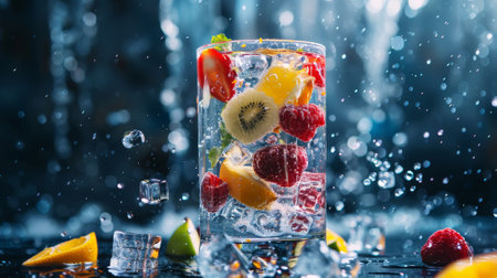 Frozen glass with floating fruits, berries and water, splash of ice cubes, hot summer refreshing drink. Generative AI.