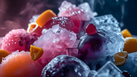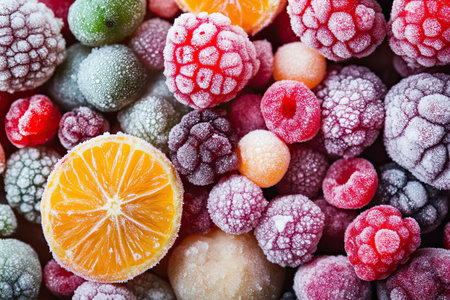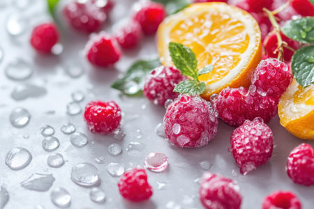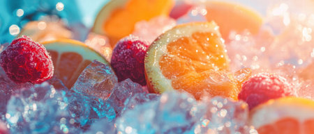 A close-up view of fresh raspberries, blueberries, and orange slices covered with sparkling frost, creating a vibrant and refreshing composition.