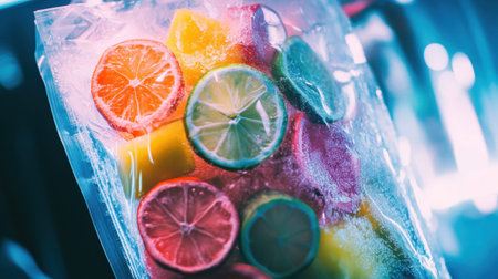 A vibrant assortment of frozen fruit slices including lemon, lime, and orange in a clear plastic bag, creating a refreshing visual perfect for summer recipes.