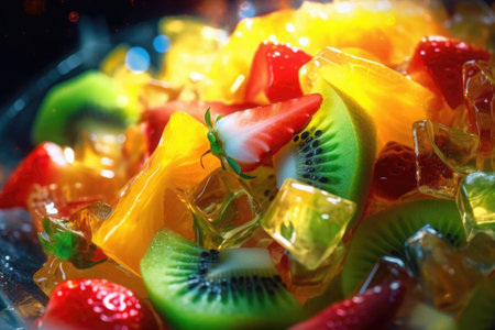 Extreme close up of an juicy fruit salad. Background of healthy fresh fruits. Generative AI illustration