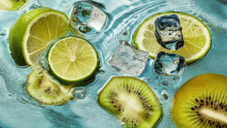 Close-up of lime and kiwi fruit slices submerged in icy water, creating a refreshing visual.
