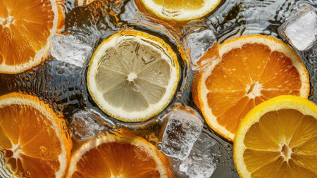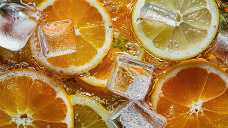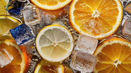 Close up of ice cubes with slices of lemon and orange in a refreshing drink