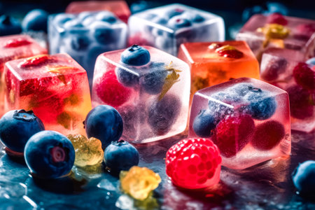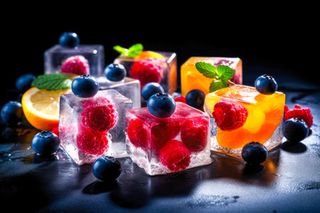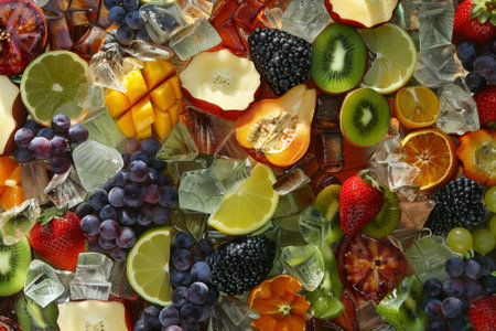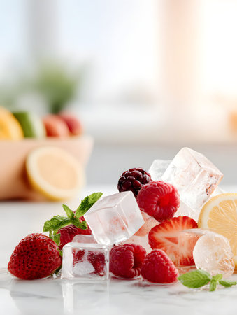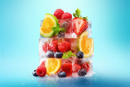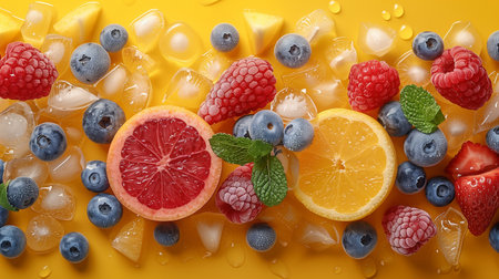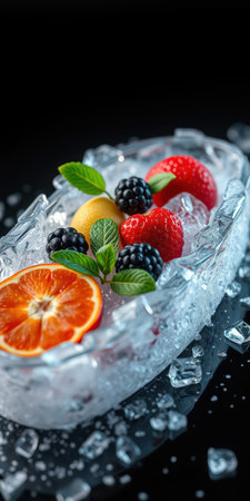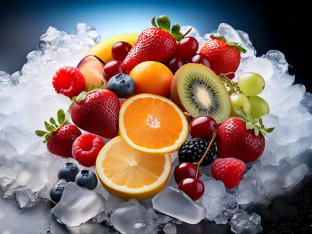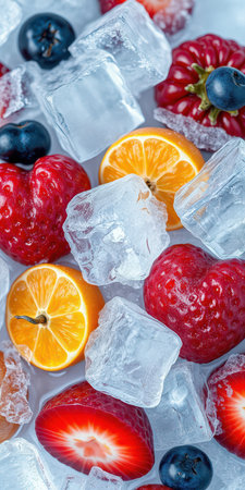A detailed close-up of assorted fresh berries and citrus fruits with ice cubes and water drops, creating a refreshing and vibrant scene. Suitable for food, summer, and freshness concepts.