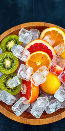 Fresh fruit assortment with ice cubes in a wooden bowl on a dark background for summer refreshments