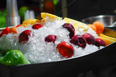 An enticing arrangement of fresh fruits and berries placed over crushed ice, creating a refreshing visual. Perfect for summer, health, and culinary projects.