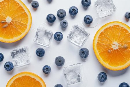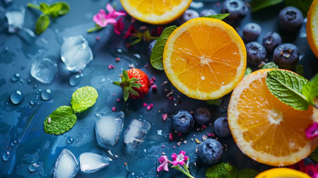 A vibrant close-up shot of fresh fruits including sliced oranges, blueberries, and a strawberry, with ice cubes and mint leaves scattered on a blue background. The image is enhanced with droplets of water and pink flowers, creating a refreshing and colorful composition.