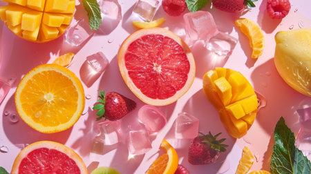 An arrangement of fresh fruits and ice cubes on a pink background, highlighting the vibrant colors and refreshing nature.