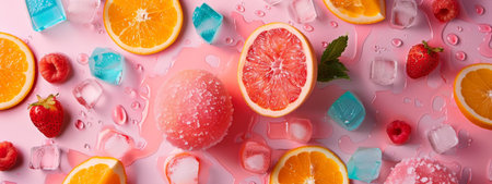 A vibrant composition of frozen treats, fresh fruits, and ice cubes on a pink background, showcasing the refreshing and colorful elements of summer desserts.