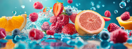 A vibrant shot of fresh berries and citrus fruits splashing into water, creating a refreshing and dynamic scene with bubbles and vibrant colors.