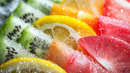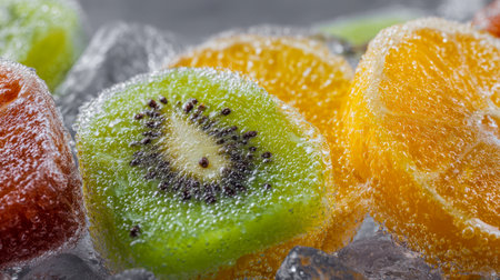 Close-up of vibrant citrus and kiwi fruit slices covered in sugar crystals, creating a refreshing, colorful texture perfect for food and summer themes.